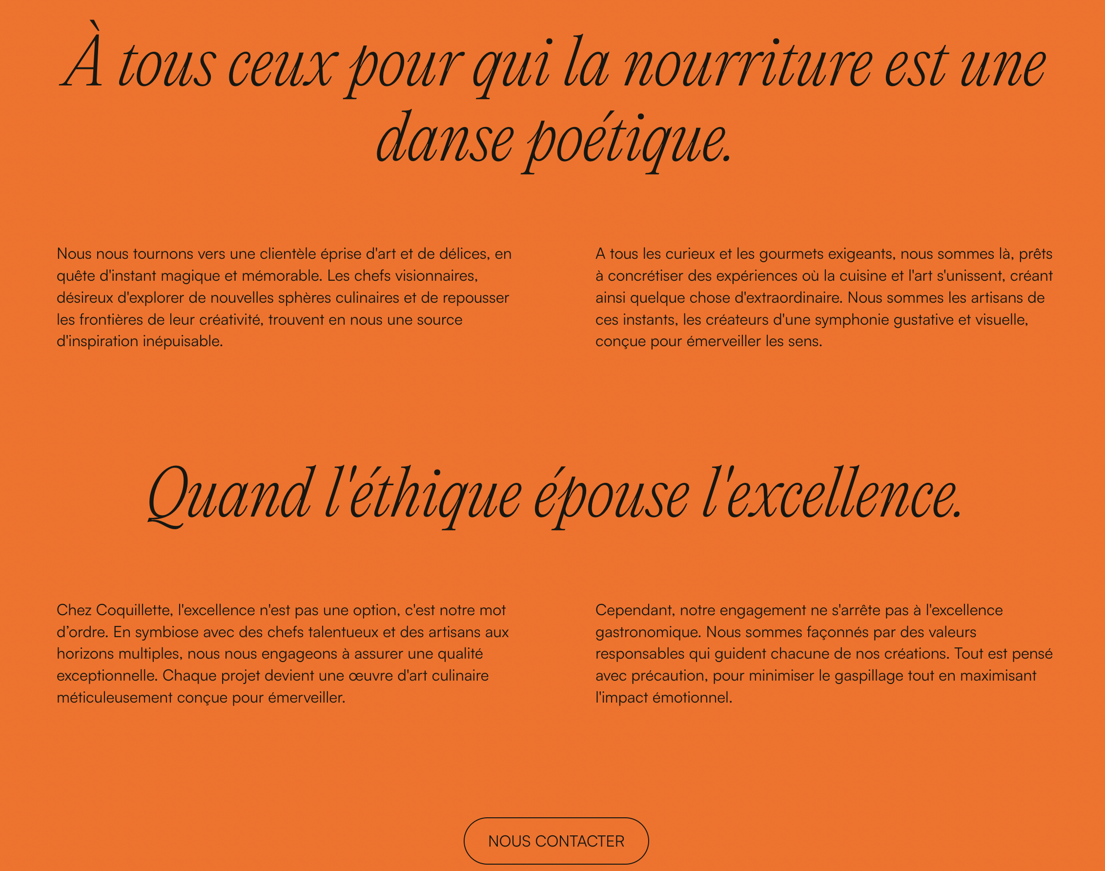 Sophie, designer culinaire derrière Coquillette, voulait des textes plus vivants, plus incarnés — à l’image de son univers gourmand et créatif. On a commencé par un audit complet de son site pour repérer les zones floues, les répétitions, les manques de rythme. Lors de nos échanges, elle m’a partagé son envie de refonte, avec une nouvelle structure en préparation : l’occasion parfaite pour revoir le fond avant la forme. Je lui ai ensuite livré mes intentions, mes propositions de ton et plusieurs passages réécrits, prêts à être intégrés.